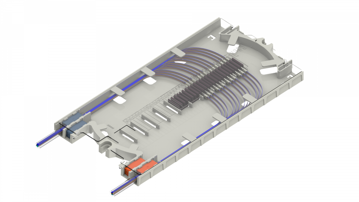 Routing channels allow fibers to enter the splice tray at the same entrance point, allowing buffer tubes and transportation tubes to coil easily within the closure