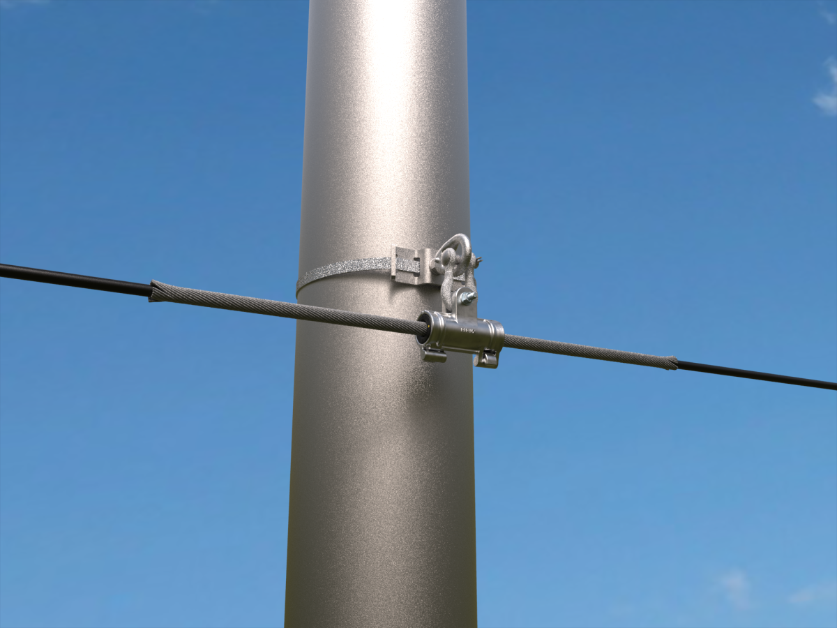 The FIBERLIGN Aluminum Suspension (FASN) with Structural Reinforcing Rods (SRR) is designed to gently, but firmly, suspend ADSS cable. Structural Reinforcing Rods (SRR) and conductive taped inserts are deployed in high-voltage environments and long span applications, as required for transmission portions of the cable network.