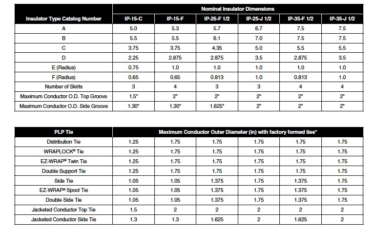 The PLP Tie Top Polymer Insulators are designed to match the head, neck and mounting pin requirements of ANSI C29.5, Class 55-3, 55-4, 55-5, 55-6, and 55-7 as well as ANSI C29.6, Class 56-1 pin-type insulator standards. “C” (2 -1/4" nominal), “F” (2-7/8" nominal) and “J” (3-1/2") neck sizes are available. By using ANSI head and neck dimensional standards, PLP metal or plastic factory formed ties will install easily and provide superior holding and electrical performance on PLP Tie Top Polymer Insulators. Consult PLP for the suitability of other factory formed tie brands with these insulators. Covered or bare hand tie wire is also suitable for use with PLP Tie Top Polymer Insulators depending on conductor type.