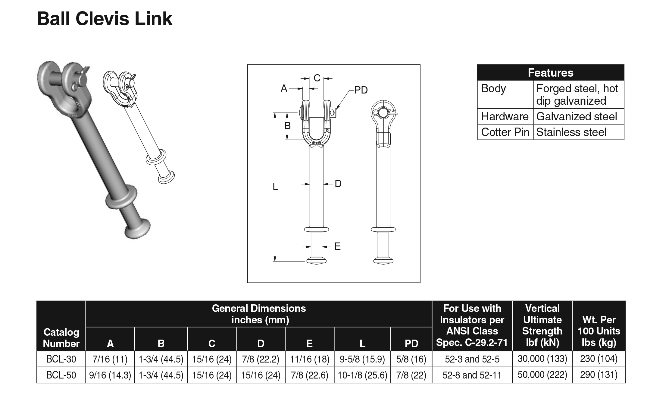 - Body: forged steel, hot dip galvanized